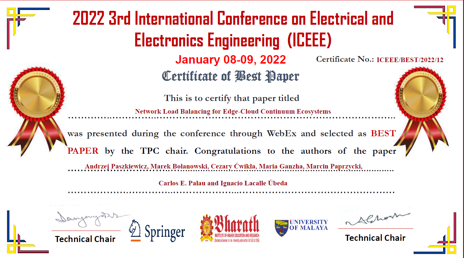 W dniu 08.01.2022 dr inż. Andrzej Paszkiewicz pracownik Zakładu Systemów Złożonych wygłosił referat pt. „ Network Load Balancing for Edge-Cloud Continuum Ecosystems” podczas 3rd International Conference on Electrical and Electronics Engineering (ICEEE 2022 8-9.01.2022). Konferencja ze względów epidemiologicznych odbyła się w formule on-line.