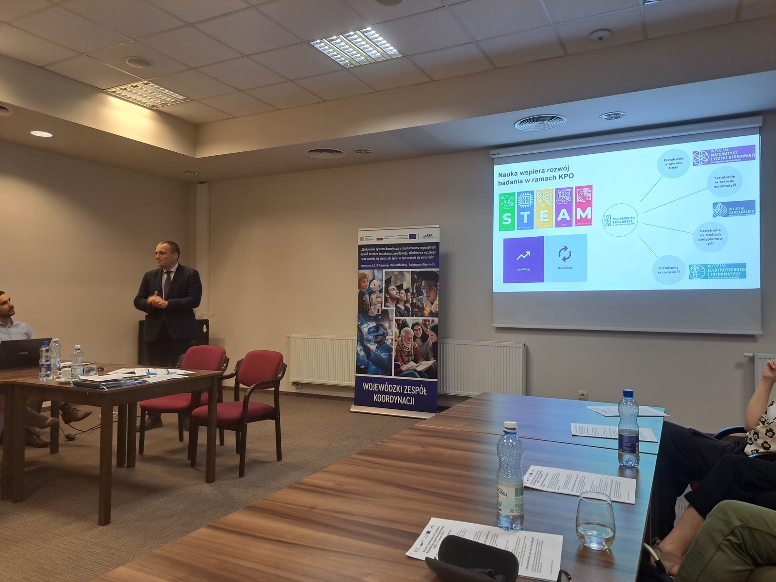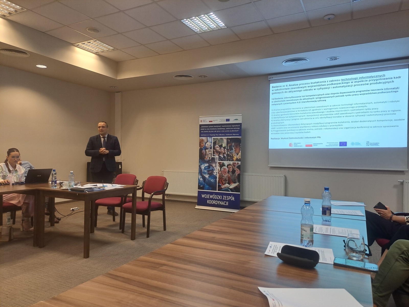 W związku z powyższym w dn. 22.07.2025 r. odbyła się V posiedzenie Wojewódzkiego Zespołu Koordynacji dotyczące zaprezentowania badań prowadzonych w ramach całego projektu. W posiedzeniu wzięli udział m.in. dr M. Mazurek i dr hab. inż. D. Strzałka, prof. PRz. W czasie posiedzenia została przedstawiona prezentacja pt. Badania i działania w obszarze matematyki, fizyki, informatyki i automatyki oraz studiów podyplomowych oraz dyskusja na temat zakresu realizowanych przez Politechnikę Rzeszowską badań.