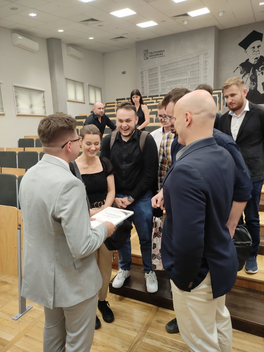 Rozprawa nosiła tytuł: Redukcja niespójności w macierzach porównań parami i nowy algorytm generowania losowych macierzy porównań parami o zadanym zakresie współczynników niespójności - FAST-PCM” zaś promotorem rozprawy był dr hab. inż. Dominik Strzałka, prof. PRz, zaś promotorem pomocniczym Pani dr Edyta Łukasik z Politechniki Lubelskiej.