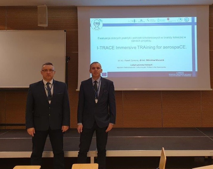 W dniu 3.12.2019 na Politechnice Rzeszowskiej odbyła się Konferencja Rady Partnerów Centrum Zaawansowanych Technologii AERONET ”Dolina Lotnicza” VIII Forum Współpracy NAUKA – GOSPODARKA. W wydarzeniu brali udział pracownicy Zakładu Systemów Złożonych: dr inż. Paweł Dymora, dr inż. Mirosław Mazurek oraz mgr inż. Bartosz Kowal. Podczas Konferencji między innymi zaprezentowane zostały dotychczasowe osiągnięcia i wyniki prac badawczych realizowanych w ramach projektu: „I-TRACE Immersive TRAining for aerospaCE”, realizowanego przez Wydział Elektrotechniki i Informatyki oraz Wydział Budowy Maszyn i Lotnictwa Politechniki Rzeszowskiej pod kierownictwem Pani prof. dr hab. inż. Romany Śliwy w ramach programu Erasmus+. Efekty realizacji projektu i-Trace zostały przygotowane i zaprezentowane przez dra inż. Mirosława Mazurka i dra inż. Pawła Dymorę, w prezentacji pt.: „Ewaluacja dobrych praktyk i potrzeb szkoleniowych w branży lotniczej w ramach projektu I-TRACE Immersive TRAining for aerospaCE.” W prezentacji szczegółowo omówiono rezultaty badań porównawczych dotyczących umiejętności i potrzeb zawodowych związanych z sektorem lotniczym na poziomie europejskim oraz wybrane najlepsze praktyki w treningu immersyjnym. Kolejnym etapem realizacji projektu będzie organizacja warsztatów i szkoleń dotyczących wdrażania symulacji komputerowych w procesie dydaktycznym i analiza procesów immersyjnego uczenia się. Szkolenia odbędą się w lutym 2020 roku.