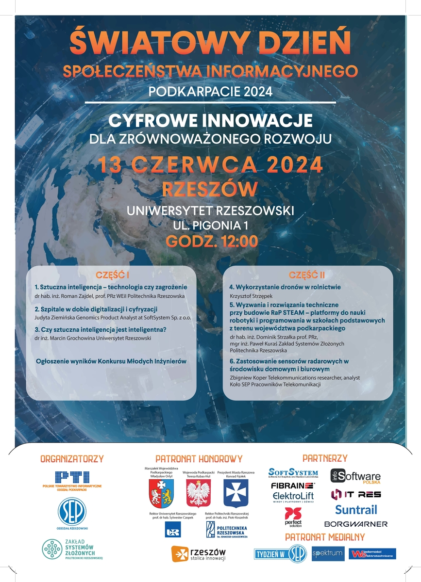 13 czerwca 2024 roku na Uniwersytecie Rzeszowskim odbyła się konferencja z okazji Światowego Dnia Telekomunikacji i Społeczeństwa Informacyjnego (ŚDTiSI). Wydarzenie, zorganizowane przez Polskie Towarzystwo Informatyczne Oddział Podkarpacki, Stowarzyszenie Elektryków Polskich Oddział Rzeszowski oraz Zakład Systemów Złożonych Politechniki Rzeszowskiej, przyciągnęło wielu specjalistów, naukowców oraz entuzjastów nowych technologii.