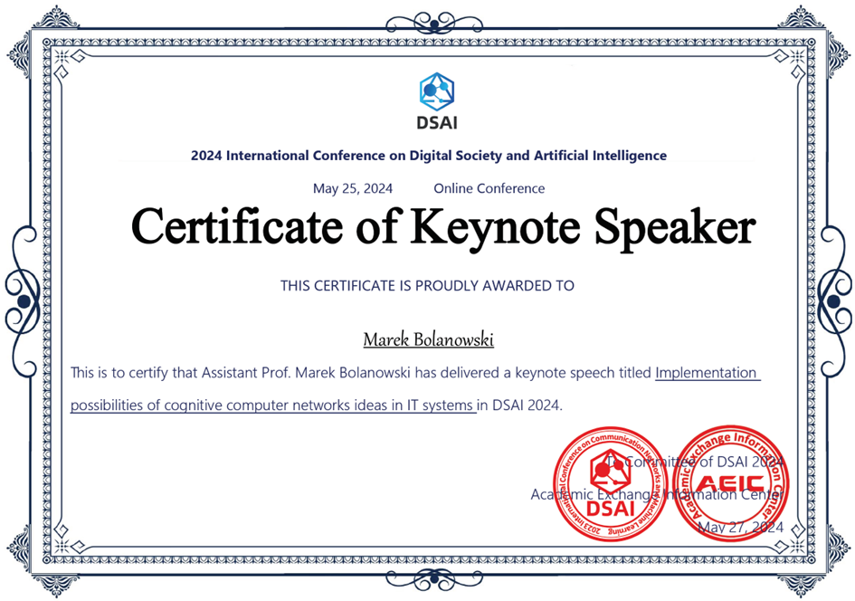 Dr inż. Marek Bolanowski był prelegentem na konferencji 2024 International Conference on Digital Society and Artificial Intelligence, która odbyła się w dniach 24 do 26 maja 2024 w Chinach.