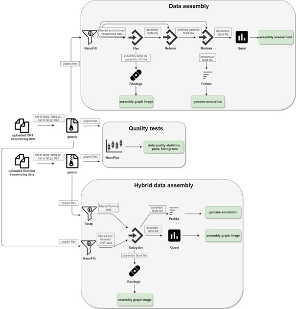 W Zakładzie Systemów Złożonych została zakończona realizacja projektu pt. Technologia Oxford Nanopore: optymalizacja enzymów oraz analizy danych genomicznych pod kątem zastosowań komercyjnych. Efektem realizacji tego projektu jest zupełnie nowy serwer NanoForms analiz danych bioinformatycznych. Przygotowany serwer, dostępny pod adresem http://nanoforms.tech, jest w stanie obsłużyć małe genomy (do 50 MB). Po załadowaniu pojedynczego plik sekwencji (fastq), dane są wstępnie przetwarzane a użytkownik na bieżąco wybiera dostępne opcje, co pozwala na uzyskanie sekwencji DNA/RNA w postaci pliku fasta. Dla serwera NanoForms opracowano autorski algorytm pipeline przetwarzania danych z ONT. W czasie budowy serwera, ponadplanowo rozszerzono jego funkcjonalność o tzw. złożenie hybrydowe (wraz z danymi z urządzenia Illumina ), co znacząco poprawia ostateczną jakość sekwencjonowania.