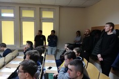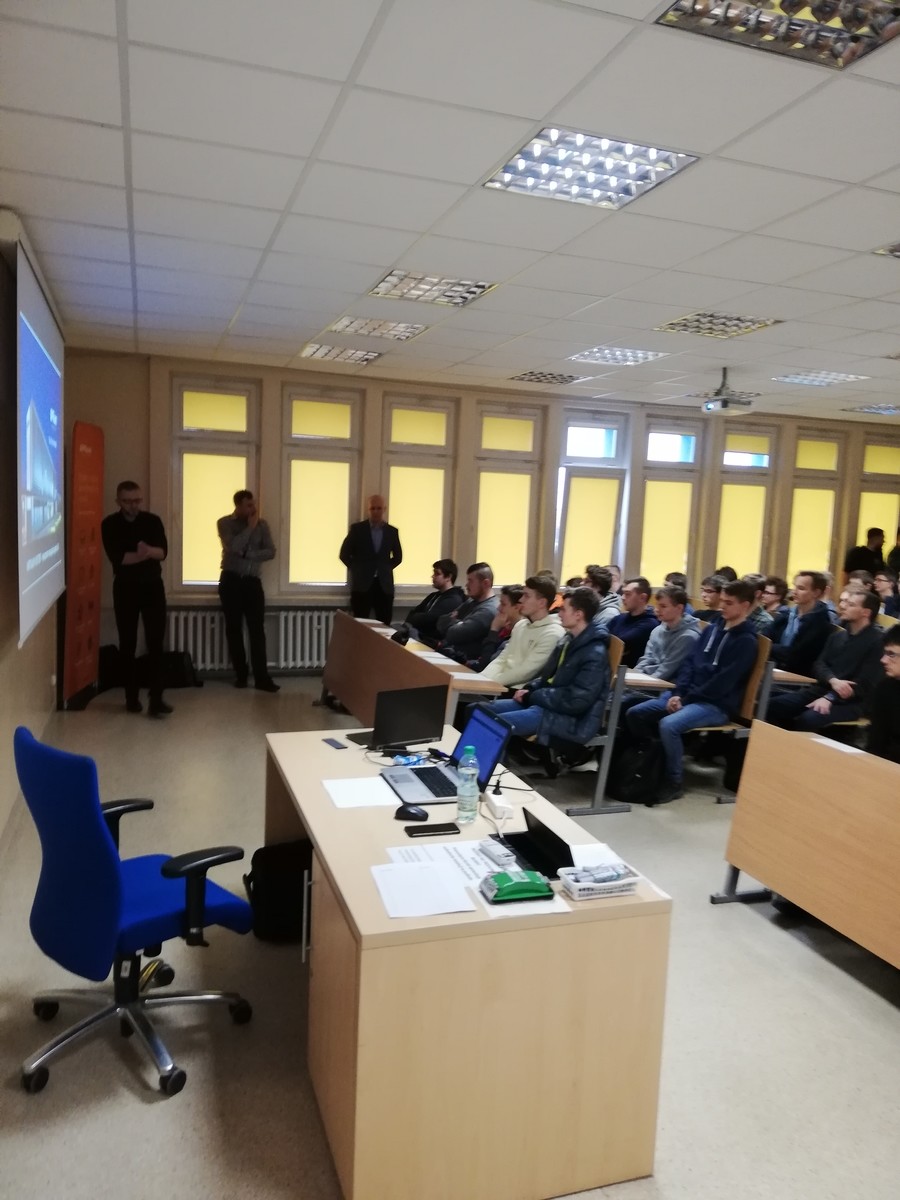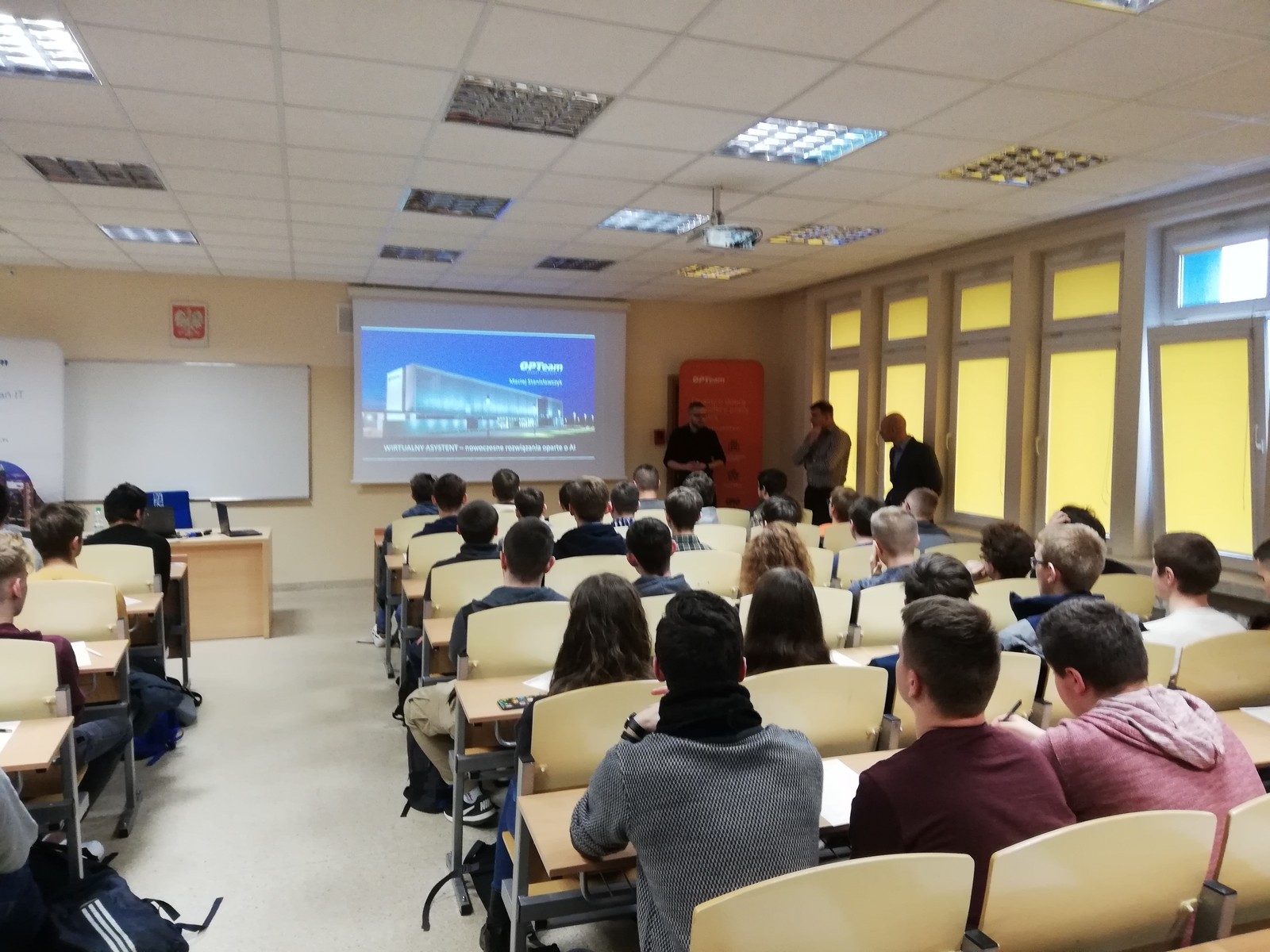 Podczas spotkania eksperci OPTeam prezentowali zagadnienia związane z użyciem BOTów konwersacyjnych w procesie komunikacji studentów z uczelnią, np. w systemie USOS. NA spotkaniu było prawie 120 studentów WEiI.