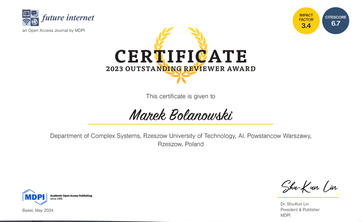 Redakcja czasopisma MDPI Future Internet wyróżniła pracownika Zakładu Systemów Złożonych Dr inż. Marka Bolanowskiego prof. PRz za jakość recenzji.