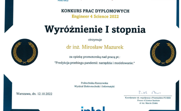 Praca dyplomowa pt. "Predykcja przebiegu pandemii: narzędzia i modelowanie" autorstwa inż. Kamila Łyczko zrealizowana pod opieką dr. inż. Mirosława Mazurka zostałą wyróżniona.