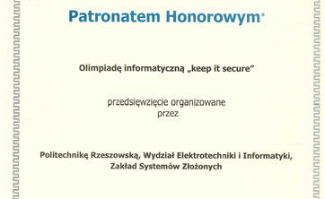 Podkarpacki Kurator Oświaty obejmuje patronatem honorowym olimpiadę informatyczną "keep it secure" organizowaną przez Zakład Systemów Złożonych, Wydziału Elektrotechnik i Informatyki