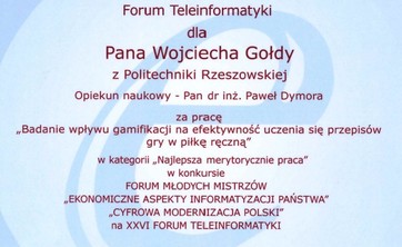 Praca dyplomanta p. Wojciecha Gołdy została wyróżniona podczas Forum Młodych Mistrzów – „Ekonomiczne aspekty informatyzacji państwa” na XXVI Forum Teleinformatyki