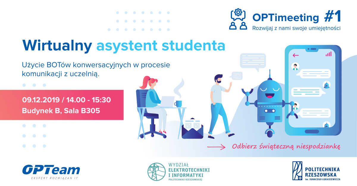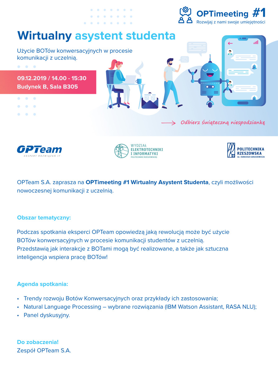 Podczas spotkania eksperci OPTeam opowiedzą jaką rewolucją może być użycie BOTów konwersacyjnych w procesie komunikacji studentów z uczelnią. Przedstawią jak interakcje z BOTami mogą być realizowane, a także jak sztuczna inteligencja wspiera pracę BOTów!