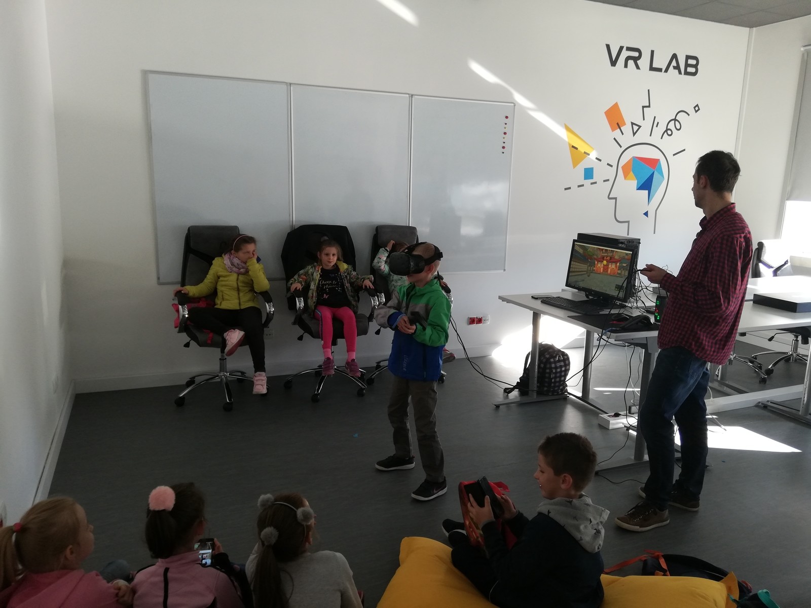 Dynamiczny rozwój nowoczesnych technologii ICT sprawia, że zainteresowani nimi są także najmłodsi. W piątek 12 października gościliśmy na Wydziale Elektrotechniki i Informatyki wycieczkę uczniów klasy drugiej ze Szkoły Podstawowej nr 1 w Ropczycach. Grupa 22 uczniów wraz z opiekunami miała szansę zobaczyć, jak wygląda Laboratorium Wirtualnej Rzeczywistości oraz Laboratorium systemów pomiarowych. Specjalne pokazy dla najmłodszych przygotowali mgr inż. Mateusz Salach z Zakładu Systemów Złożonych oraz dr inż. Jakub Wojturski z Katery Metrologii i Systemów Diagnostycznych. W Laboratorium wirtualnej rzeczywistości dzieci miały szansę zmierzyć się z wymaganiami, jakie stawiała przed nimi wirtualna gra; liczył się najlepszy wynik osiągnięty podczas jednej minuty gry. Także tajniki metrologii były odkrywane przez wszystkich zainteresowanych. Ponadto dzieci brały udział w pokazie z fizyki przygotowanym przez pracowników Katery Fizyki i Inżynierii Medycznej pod kierunkiem prof. T. Jasińskiego.