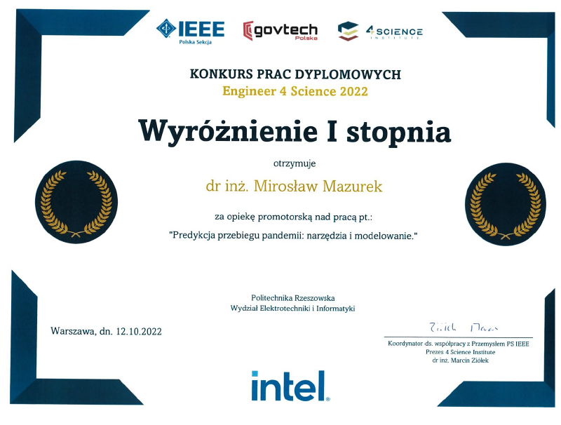 Polska Sekcja IEEE, GovTech Polska oraz 4 Science Institute Sp. z o. o. działając wspólnie w celu umocnienia współpracy środowiska akademickiego oraz przedsiębiorstw, wspierania wyższej edukacji i promowania najlepszych absolwentów wyższych szkół technicznych w ramach Konkursu Engineer 4 Science 2022 wyróżniła pracę dyplomową pt. "Predykcja przebiegu pandemii: narzędzia i modelowanie" autorstwa inż. Kamila Łyczko zrealizowaną pod opieką dr. inż. Mirosława Mazurka.