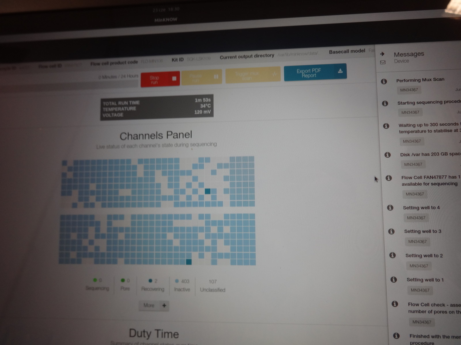 W dniach 22-26.06.2020, w ramach realizacji projektu „Technologia Oxford Nanopore: optymalizacja enzymów oraz analizy danych genomicznych pod kątem zastosowań komercyjnych”, na Politechnice Rzeszowskiej został przeprowadzony eksperyment sekwencjonowania DNA z wykorzystaniem technologii Oxford Nanopore. Eksperyment podzielono na dwie części – doświadczalną oraz bioinformatyczną, realizowane, odpowiednio, w Zakładzie Biotechnologii i Bioinformatyki Wydziału Chemicznego oraz w Zakładzie Systemów Złożonych Wydziału Elektrotechniki i Informatyki. Sprawne przeprowadzenie sekwencjonowania, jak również prawidłową analizę uzyskanych danych, nadzorował mgr Jan Gawor z Pracowni Sekwencjonowania DNA i Syntezy Oligonukleotydów Instytutu Biochemii i Biofizyki PAN. W część pierwszą eksperymentu byli zaangażowani przede wszystkim: dr Marta Sochacka-Piętal, dr Michał Pietal, mgr Małgorzata Semik, mgr Michał Wroński. Niezbędnej pomocy organizacyjno-technicznej udzielił także dr hab. inż. Mirosław Tyrka, prof. PRz. W części drugiej, bioinformatycznej, wymagane było zaangażowanie pozostałej części zespołu projektowego, w tym dr inż. Dominik Strzałka, mgr Magdalena Totoń, inż. Michał Ćmil i mgr inż. Anna Czmil. Eksperyment trwał 5 dni roboczych: pierwsze dwa dni dotyczyły pracy w laboratorium mokrym, pozostałe dni przeznaczono na prace o charakterze bioinformatycznym w tym na analizy danych oraz ich przetwarzanie na serwerach Zakładu Systemów Złożonych.