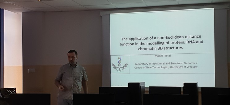 Using the invitation dr Michał Piętal gave a lecture entitled "Application of a non-Euclidean distance function in modelling of protein, RNA and chromatin 3D structures"