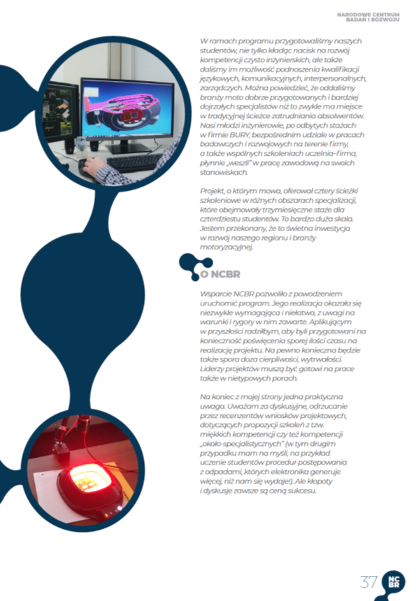 The POWER project Electronics for the automotive industry (POWR.03.01.00-00-T006/17), carried out in the period from 01.2018 to 10.2019 by the Faculty of Electrical and Computer Engineering, was awarded by NCBiR as one of ten best projects and is published in the official NCBR 2019 Annual Report. This report shows the best projects carried in 2019 in the fields of research, development and teaching as part of different NCBiR programs focused around: Smart Growth Operational Program (including Fast Track, Bridge Alfa), State Security and Defense Program, Era-Net Neuron, Applied Research Program, Program Leader. The project Electronics for the automotive industry is the only project from the Knowledge Education Development Operational Program (POWERE) presented in the folder. During the project a very close cooperation with a business partner, which was the Bury Company from Mielec, was required. Bury Mielec is an important supplier of consumer electronics solutions for such automotive industry giants as Audi, Volkswagen, Mercedes, BMW. During the project a team of different specialists was involved, whose the most important part were the ladies, who took care of the proper course of subsequent tasks from the administrative side. These were: Katarzyna Dudek, Magdalena Rogóż (Totoń), Magdalena Salamon, Regina Piekarz, Barbara Nowak, Monika Tyczyńska, Barbara Bernaczek, Barbara Nowak. The project manager was PhD Dominik Strzałka.